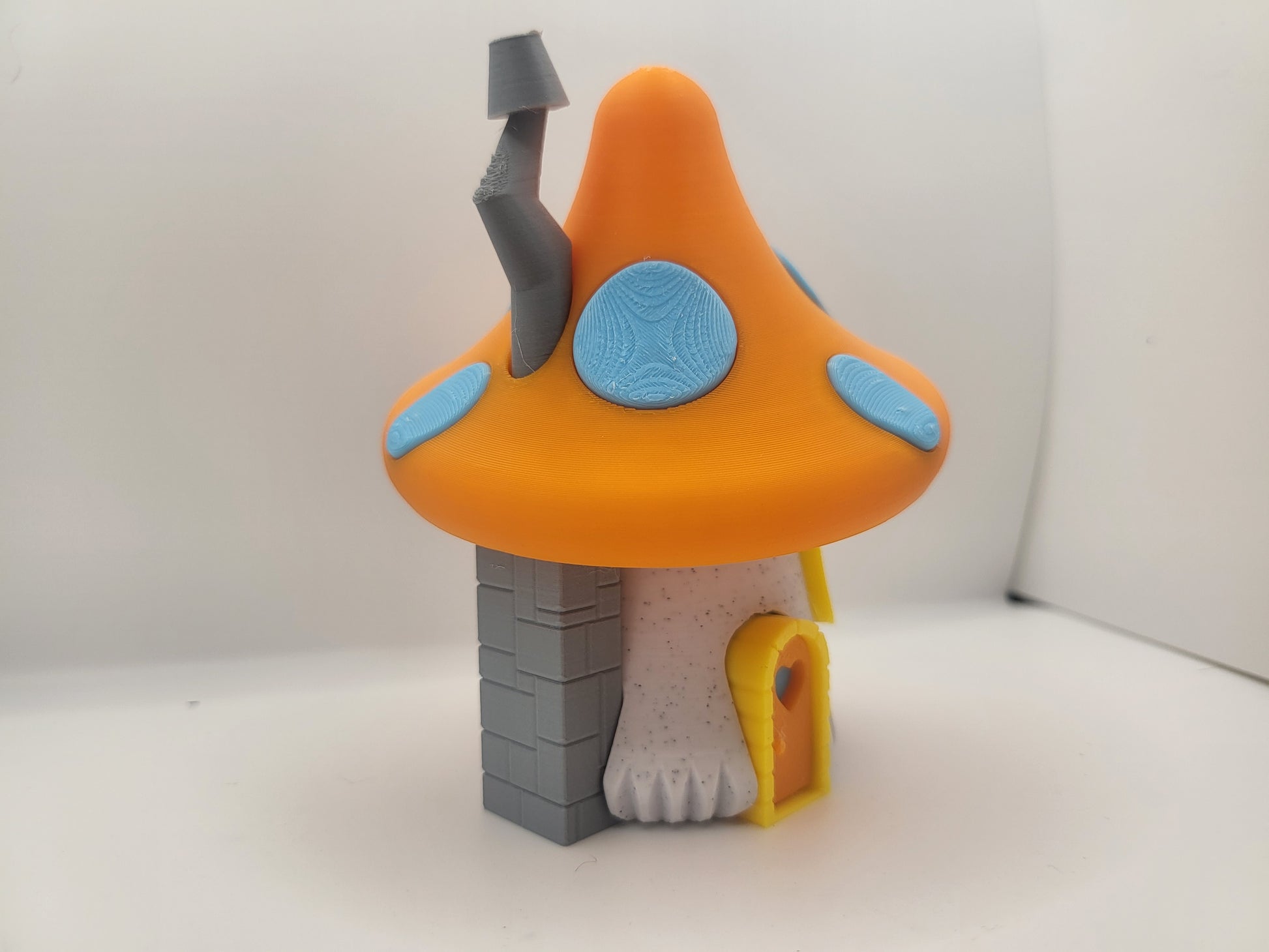Available in any of the listed colors, in which in the personalization box you can let us know if you'd like it in any other color scheme than the one listed. All the pieces are printed in parts so if you'd like a different door frame, mushroom top, mushroom base, window frames etc. a different color just be specific to the parts and colors you'd like. In the photograph: Orange Mushroom/Door, Silver Chimney, Light Blue Accents and Mushroom Spots, Yellow Door Frame/Window Pane.