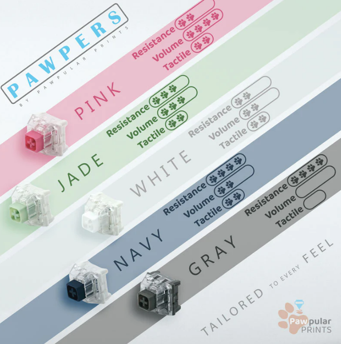 Each button features a mechanical key switch hidden inside, giving it a satisfying tactile feel and sound when pressed. We now have a variety of switches we can offer with different levels of tactile feedback, clicky volume, and resistance. Check the key in the Pawpers photo to choose the best option for you!